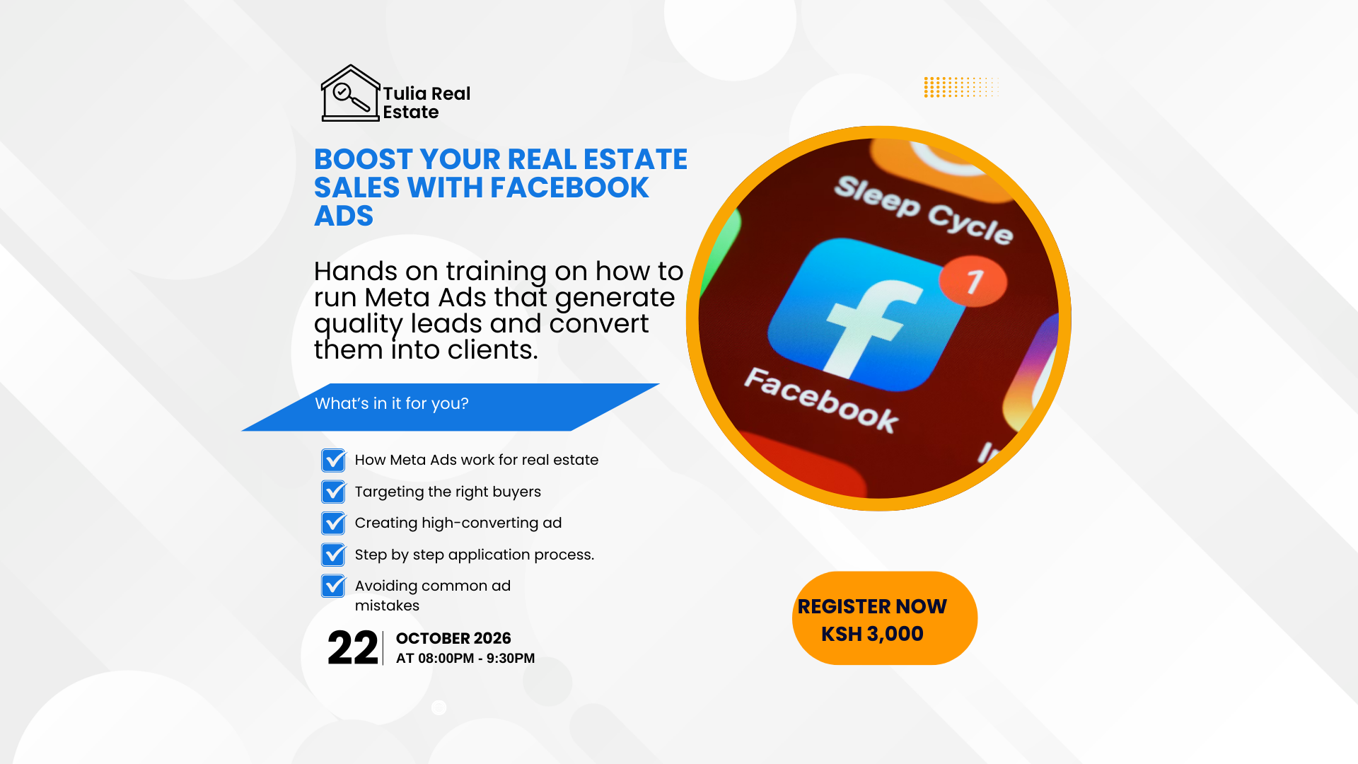 This hands-on online training is tailored for real estate professionals looking to increase sales using Facebook ads. The session will cover ad strategy for property marketing, targeting the right audience, budget optimization, lead generation, and common mistakes that cause ad spend to go to waste.
